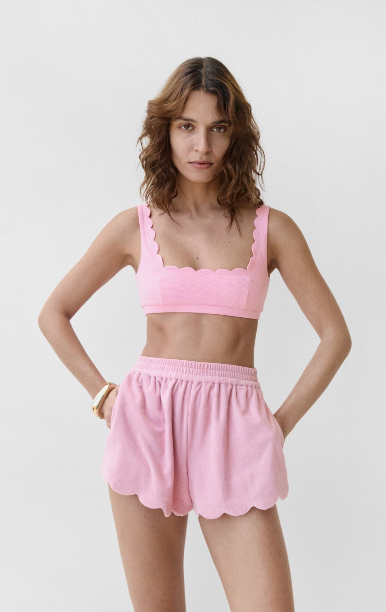 The Bellini Shorts feature an elastic waistline, pockets, and our signature scallop detailing along the high-cut hemline. These shorts are the perfect pair to any of our classic bikini tops or maillots. Now in our seasonal Rosa colorway.