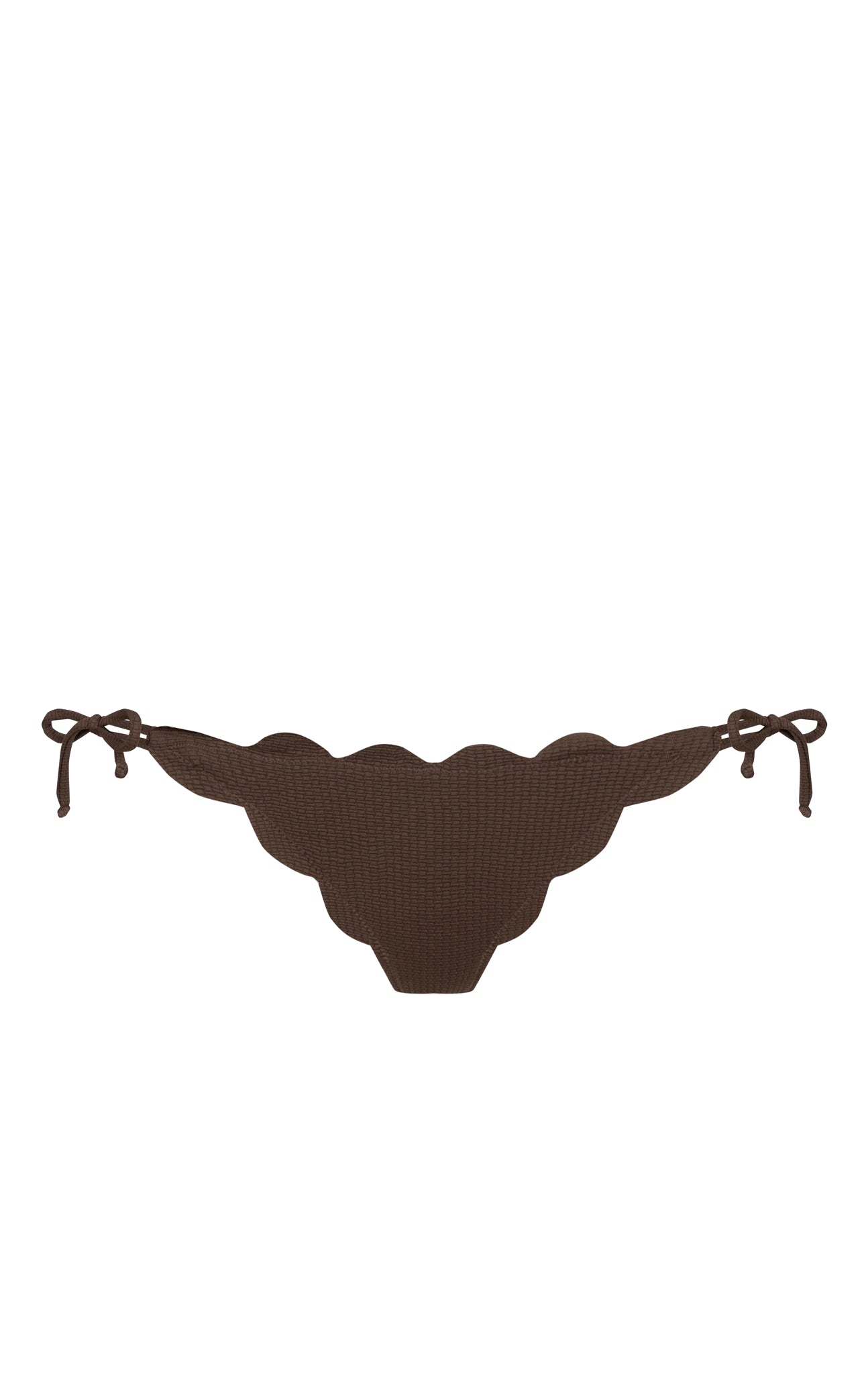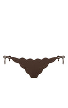 The Mott bottom is one of the Classics that provides minimal coverage. Raw edge, hand cut scallops frame this bikini bottom, finished with two string side ties. Styles well with our Mott Top or Broadway Top. Featured in our seasonal Coco colorway.