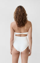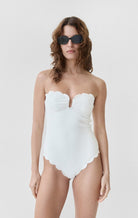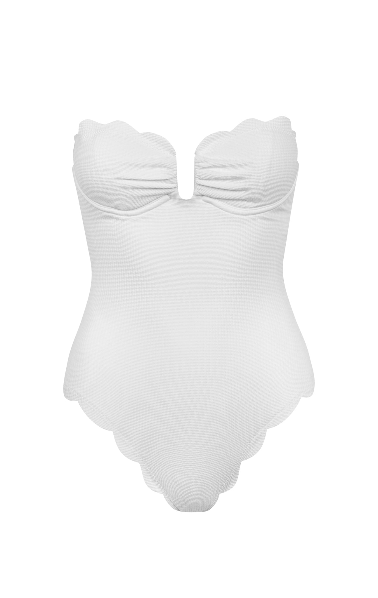 The Lisbon Maillot is one of our newest silhouettes for Spring 2025. It features a strapless neckline with a deep center notch for a feminine fit. Light ruching along the cups add shape and texture, while structured underwire provides lift and support. The one-piece is lined with our signature, scalloped detailing along its trim. Featured in our seasonal Coconut colorway.