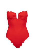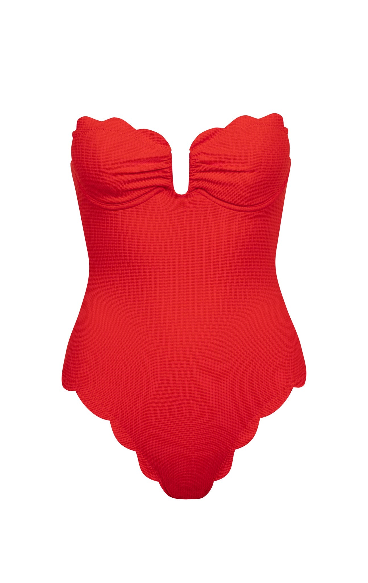The Lisbon Maillot is one of our newest silhouettes for Spring 2025. It features a strapless neckline with a deep center notch for a feminine fit. Light ruching along the cups add shape and texture, while structured underwire provides lift and support. The one-piece is lined with our signature, scalloped detailing along its trim. Featured in our seasonal Poppy colorway.