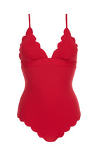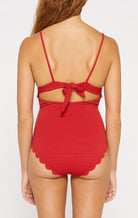 The Santa Clara Maillot has a deep v neckline with a classic triangle top. The band beneath offers shaping and support at the front, finishing as a cutout at the back, sealed with a bow. Thin straps line the shoulders meeting at the back band. Our signature raw edge, hand cut scallops trim this silhouette.