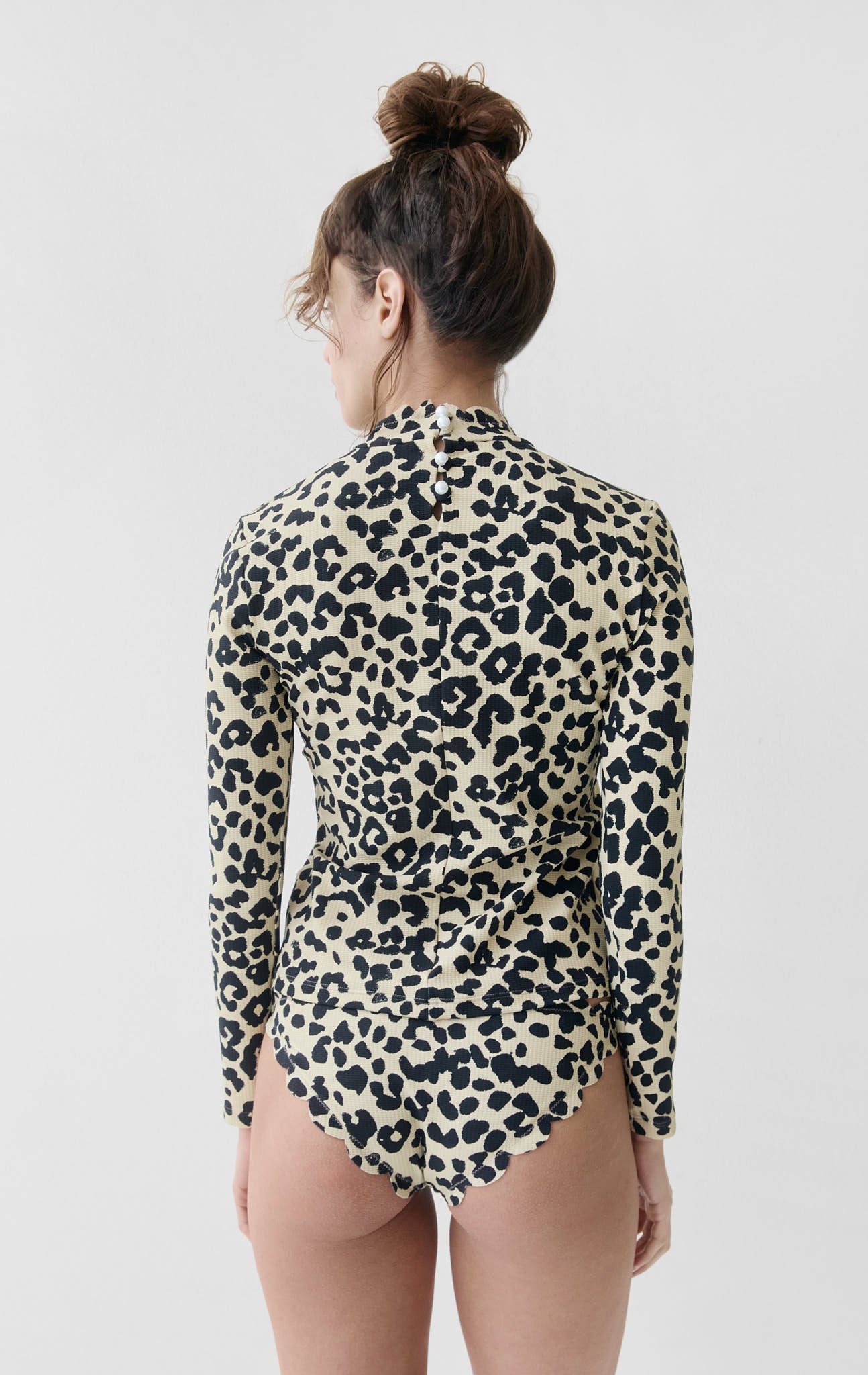 Our long-sleeved rashguard with a scalloped edge at the neck now offered in our seasonal Air colorway. The buttoned closure at the nape of the neck gives easy entry. Style with any of our scalloped Bikinis or Maillots