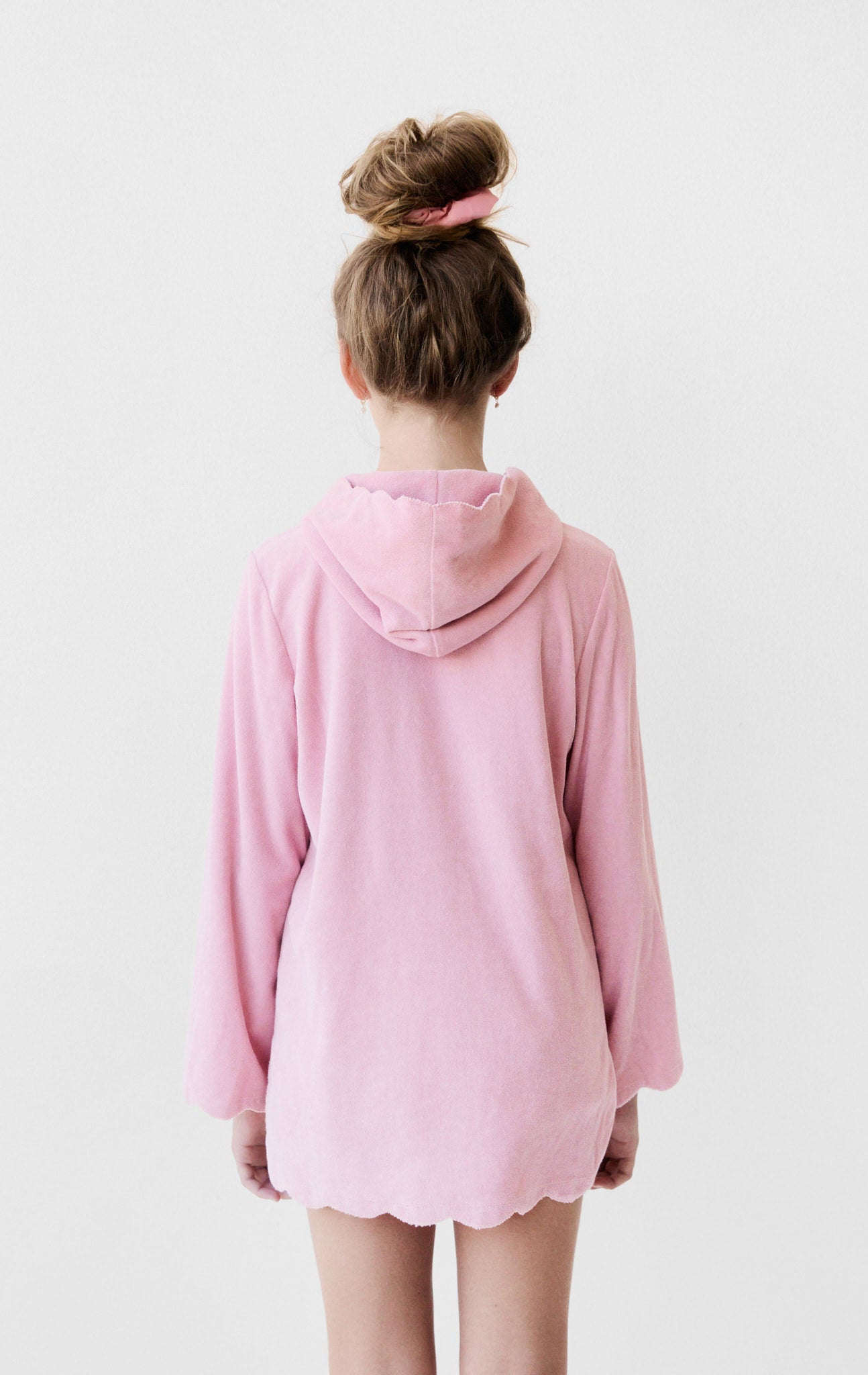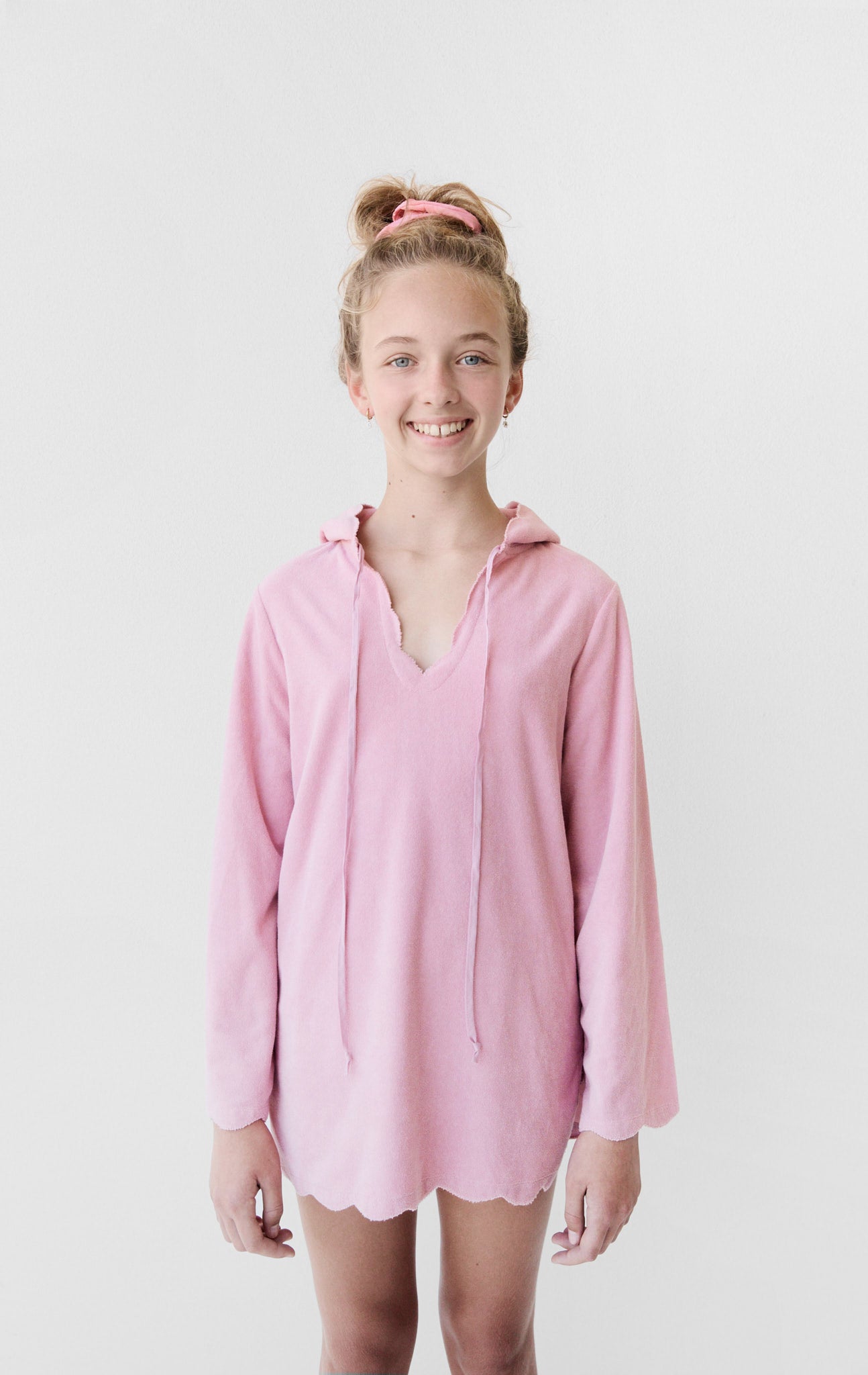 The Scalloped Terry Tunic now comes in sizes for your little one. The tunic offers an oversized, comfortable fit and is crafted with our signature scalloped trim. This piece pairs perfectly with any of our scalloped Bumby swim. Now offered in our seasonal Rosa colorway.