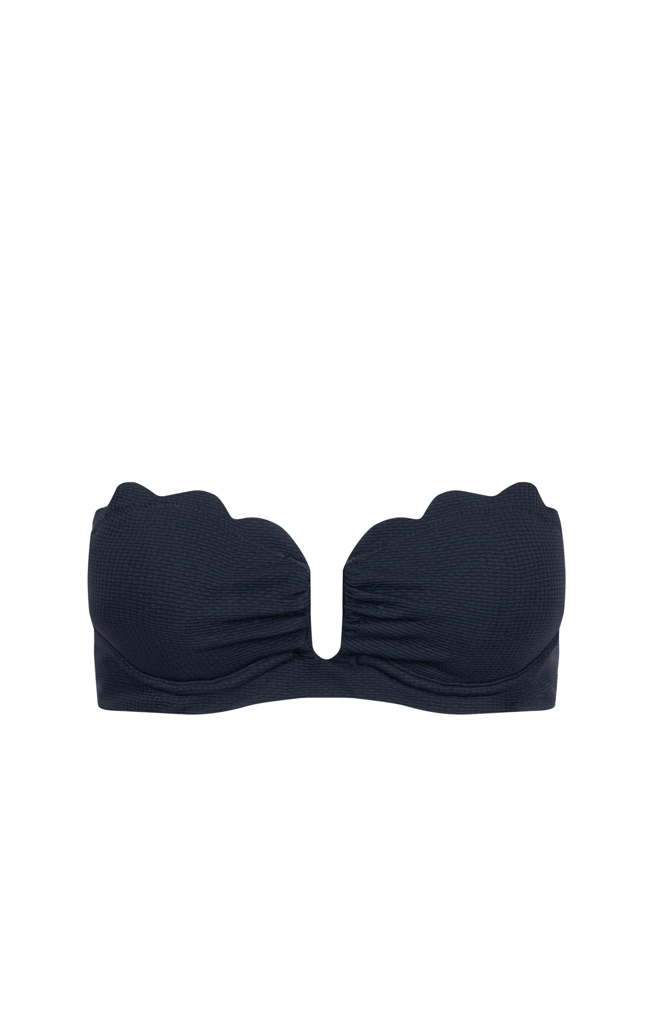 The Lisbon Top is one of our newest silhouettes for Spring 2025. It features a strapless neckline with a deep center notch for a feminine fit. Light ruching along the cups add shape and texture, while structured underwire provides lift and support. The top is lined with our signature, scalloped detailing and is secured with a clasp closure. It pairs perfectly with any of our classic, scalloped bottoms. Featured in our seasonal Black colorway.