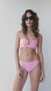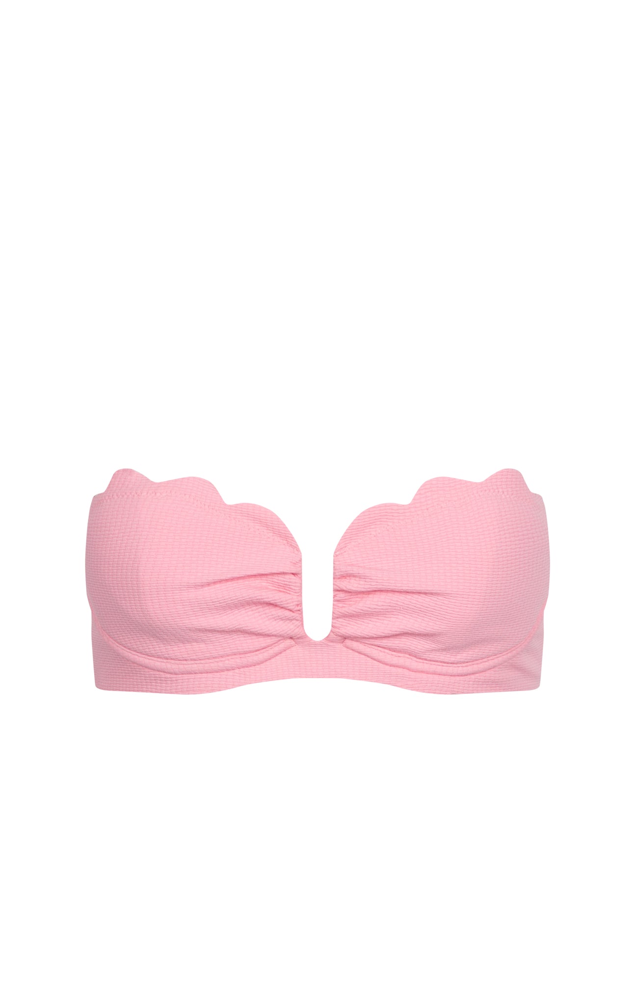 The Lisbon Top is one of our newest silhouettes for Spring 2025. It features a strapless neckline with a deep center notch for a feminine fit. Light ruching along the cups add shape and texture, while structured underwire provides lift and support. The top is lined with our signature, scalloped detailing and is secured with a clasp closure. It pairs perfectly with any of our classic, scalloped bottoms. Featured in our seasonal Rosa colorway.