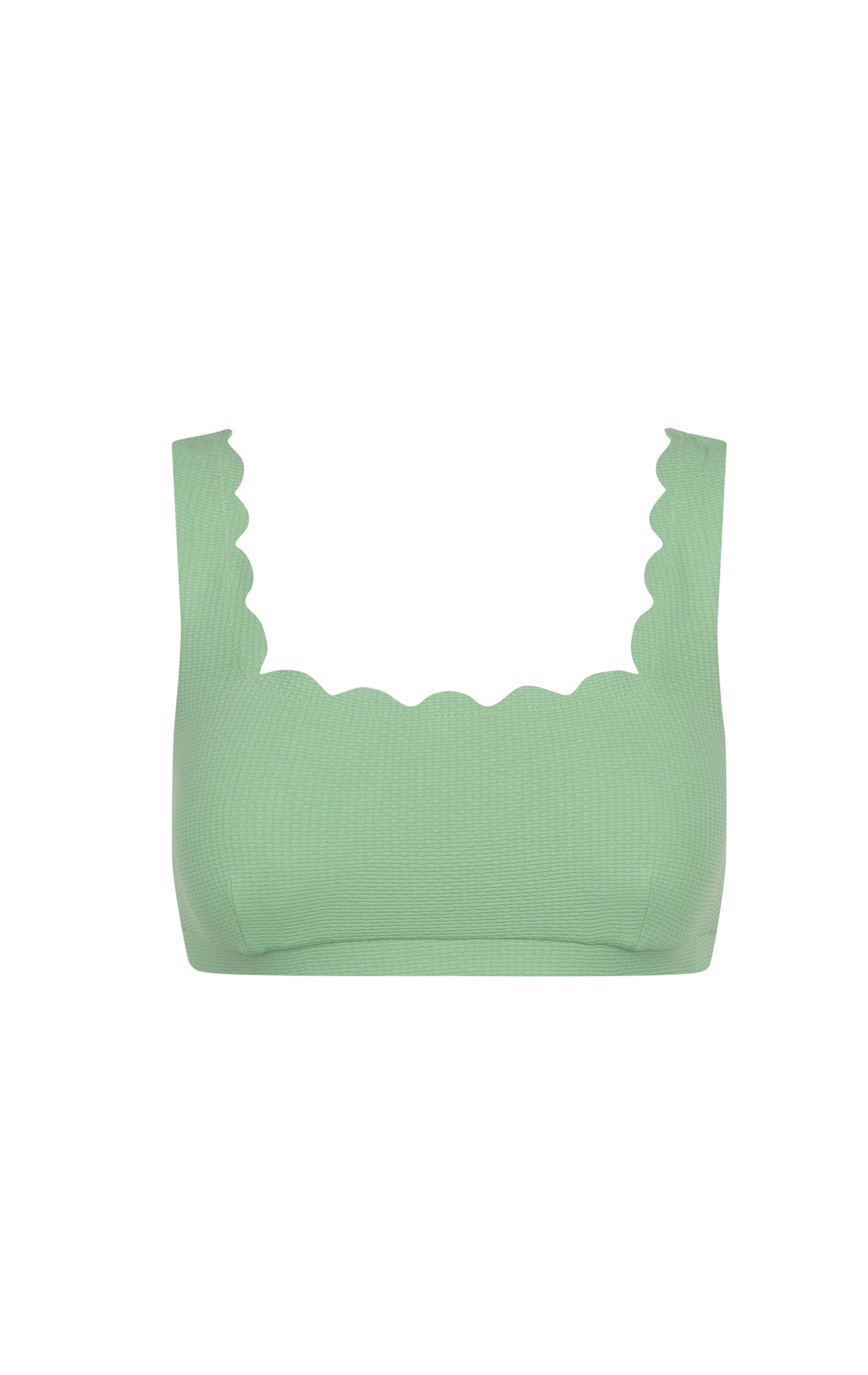 The Palm Springs Top is one of our most sought after Marysia Classics. The scalloped edge lines the square neckline. The back emulates the same, with a slightly lower drop. This style is ideal for those who prefer additional support and more coverage. Pair back to any of our scalloped edge Classic bottoms. Featured in our seasonal Mentha colorway.