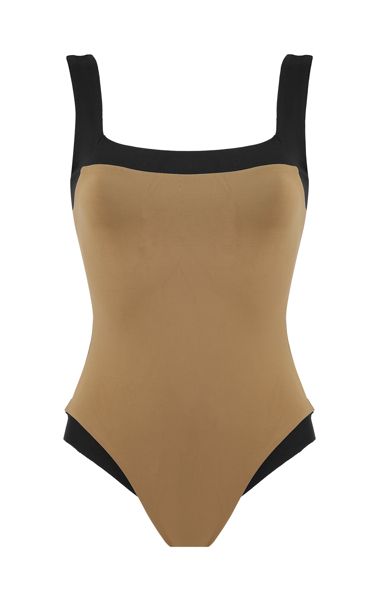 The Bianco Maillot, a new best-seller, is a one-piece suit is crafted with smooth, quick-drying fabric. It features a square neckline and back refined by contrast detailing along the bust, straps, and legs. Featured in our seasonal Chocolate colorway.