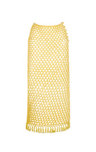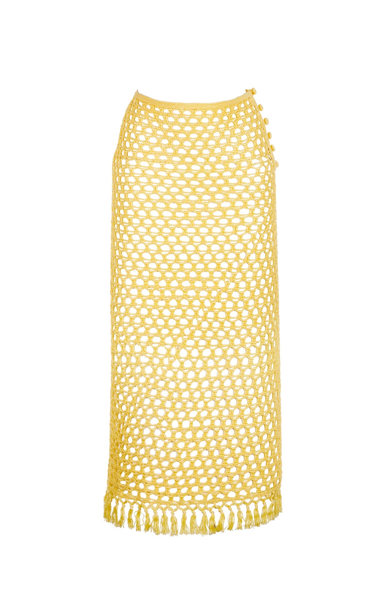 Take a journey to the Mediterranean with this hand-woven maxi skirt, crafted from natural yarn reminiscent of sea netting. Delight in the intricate details of the hem, adorned with a refined fringe and secured by buttons at the waist. The perfect statement piece for the ultimate vacation look.