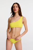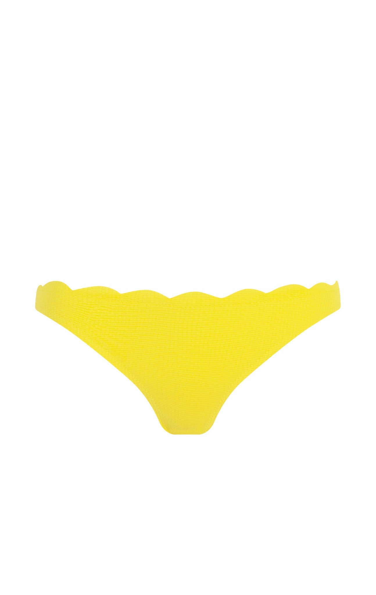 Our lower rise bikini bottom, with the raw edge, hand cut scallops trim only at the waist. A clean hem at the legs and hips offers a simple look. Styles well with any of our scallop-edge Classic tops. Now featured in our seasonal Sunshine colorway.