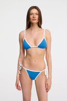 An iconic swimwear silhouette, the triangle, refined by contrast piping details. The Porto string top, ties at the neck and at the back. Pairs perfectly alongside of our contrast bottoms. Featured in our seasonal colorway, Neptune.