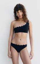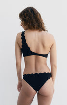 Our lower rise bikini bottom, with the raw edge, hand cut scallops trim only at the waist. A clean hem at the legs and hips offers a simple look. Styles well with any of our scallop-edge Classic tops.