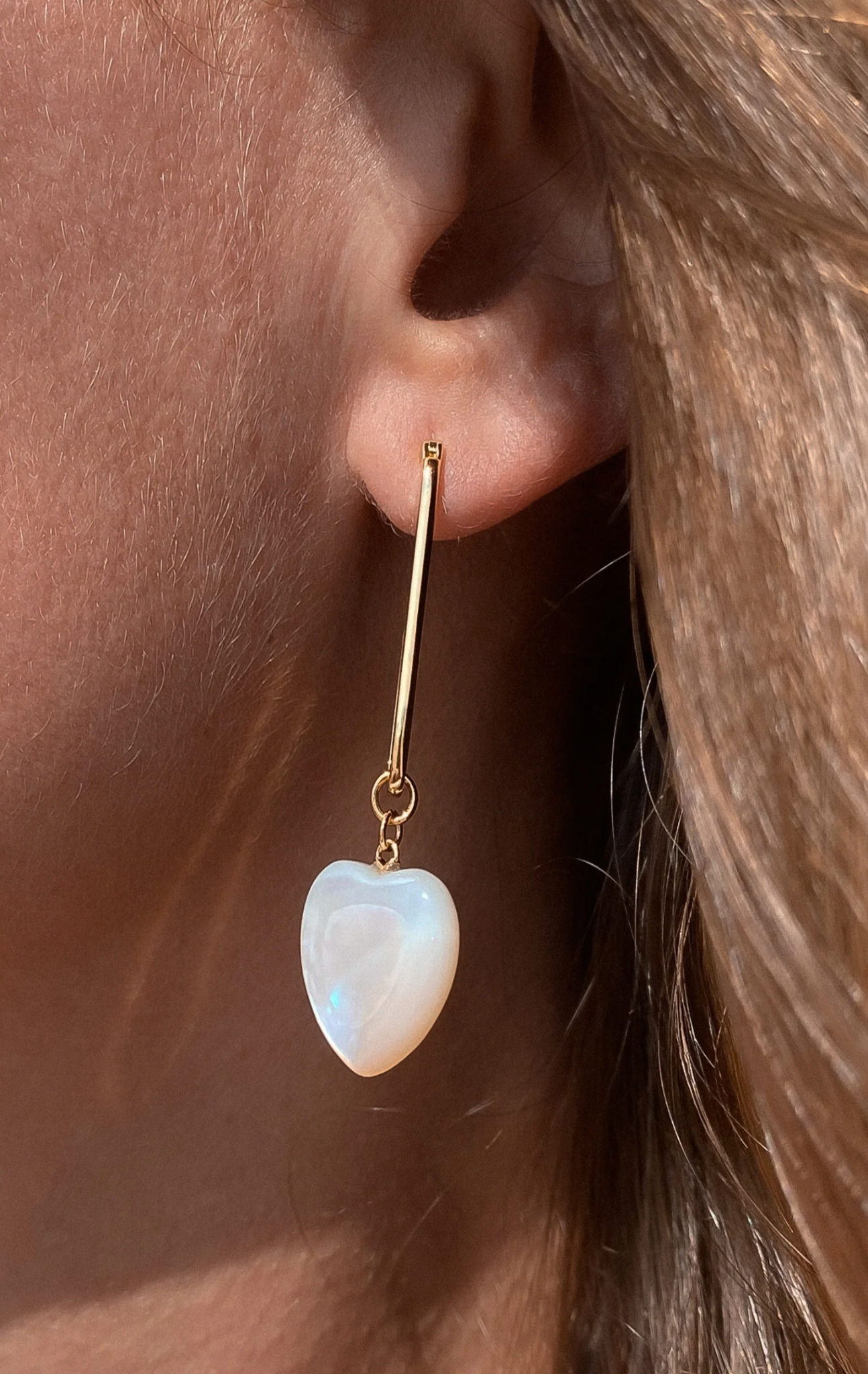 14k gold or rhodium plated sabrina hoops with carved mother of pearl puffy heart charms.