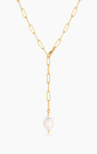 14k gold plated 3. 4mm finn elongated lariat necklace with freshwater pearl charm and adjustable lobster clasp closure. Fully adjustable 19" chain.
