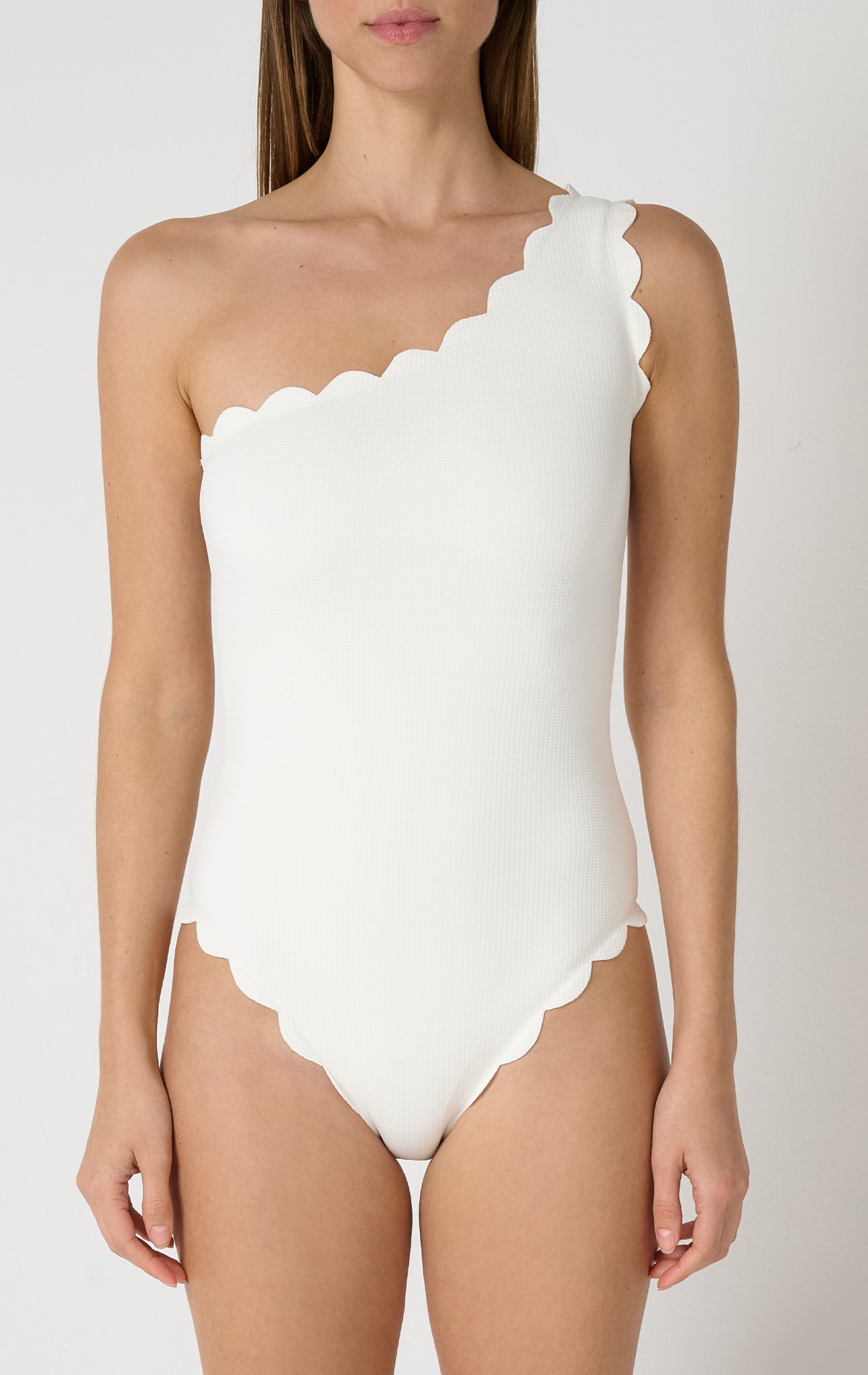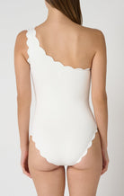 The Santa Barbara Maillot is defined by its one shoulder design. Our hand cut, raw edge signature scallops trim the asymmetrical silhouette, along with the legs and hips. A truly elevated, chic one piece.
